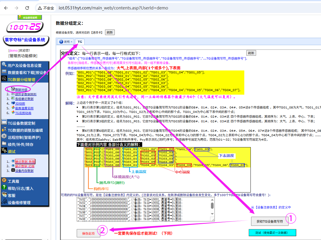 - 在网页左边菜单依次点击【TG数据分组管理】下的**【数据分组】**,请先查看本页面的说明文字; - 然后点击页面中的**【获取TG设备简写符】**(截图中标注①),点击页面中弹出的【确定】按钮,然后再点击页面中(截图中标注②)的**【保存此项】** - **重点来了** - 定义你的分组:在下面截图中蓝色背景框的位置,填写您自己的设备的上各个传感器的分组实情: