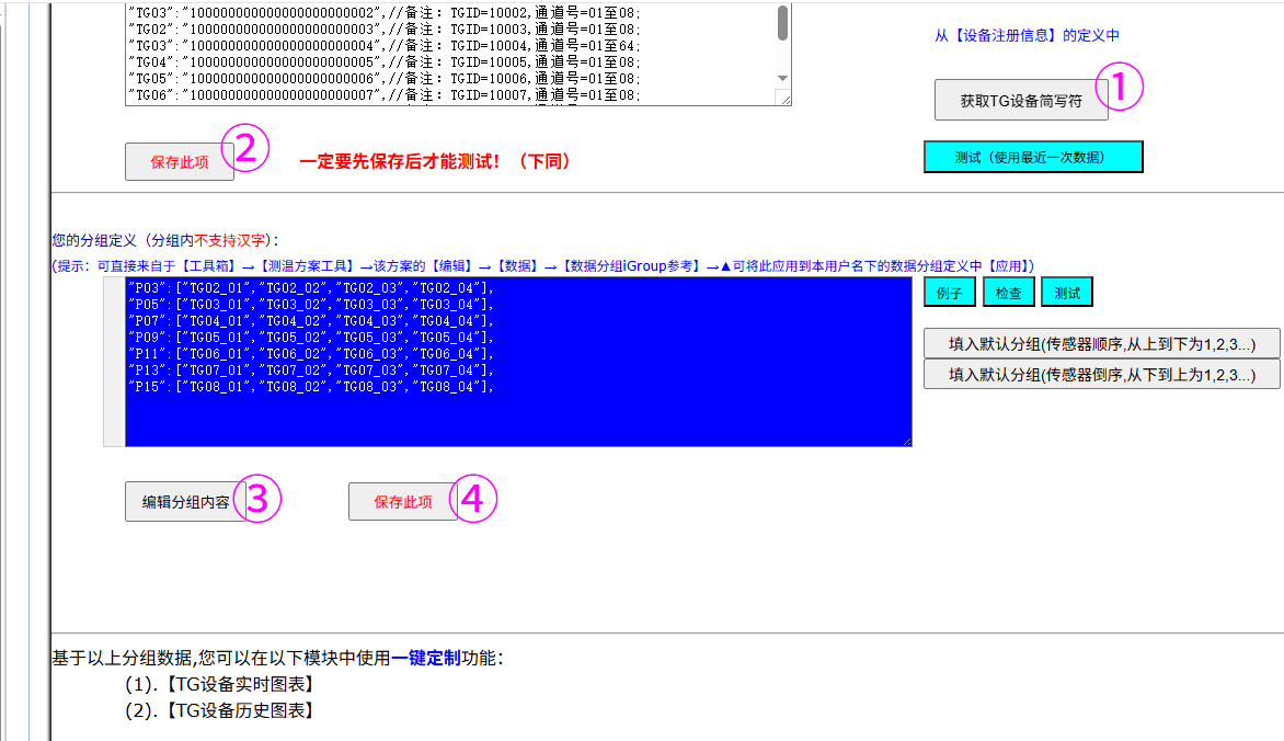 此时此处,点击**【例子】**按钮,可以看到“对TG数据分组的解释”图文内容; 点击**【检查】**按钮,可以查看你的分组定义是否有错,及使用的传感器数量; 点击**【测试】**按钮,可以查看你的分组定义下的各组最近数据列表; 点击**【编辑分组内容】**按钮(截图中标注③),可以更直观地查看你的分组及编辑你的各组;(截图如下:)