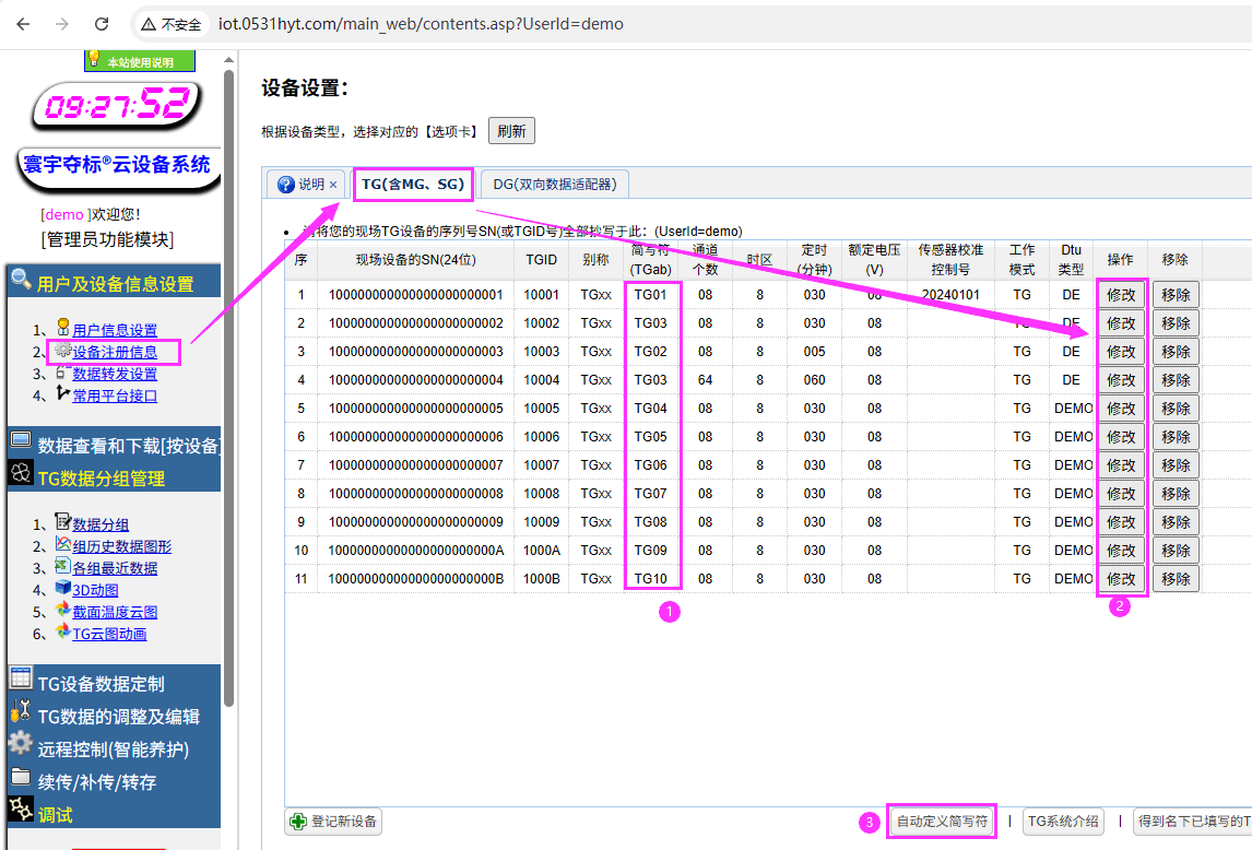 - 在网页左边菜单依次点击【用户及设备信息设置】下的**【设备注册信息】**,然后点击右边的**【TG(含MG、SG)】**, - 检查一下各个TG设备的简写符是否已经定义(下图中标注①的部分);检查TG设备的简写符是否从TG01开始;检查简写符是否有重复和遗漏; - 如果要修改某个设备的简写符,可以使用对应行的**【修改】**按钮; - 如果要自动定义所有设备的简写符,可以使用对应行的**【自动定义简写符】**按钮(截图中使用②进行了标注③); --- - **第二步:将每个TG设备上的传感器进行“数据分组”:** - 参见下面的截图: